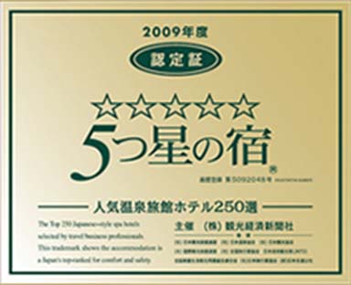 当館は、平成21年(2009年)に「5つ星の宿」に認定され、その後も平成22年、23年、24年、と常に入選を続け、「5つ星の宿」の認定も連続していただいております。