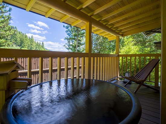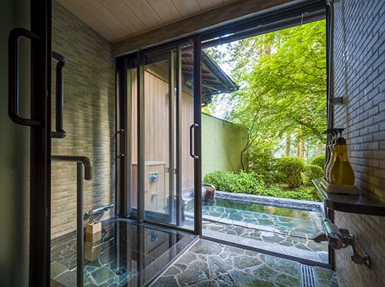 湯之島館では客室の内湯、専用露天風呂、檜風呂などのさまざまなタイプのお風呂をご用意いたしております。