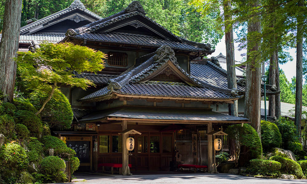 湯之島館の顔、黒々と重々しい入母屋屋根の玄関は映さない人はいないくらい。この背後に見える木造三階建ての本館が国登録の有形文化財です。