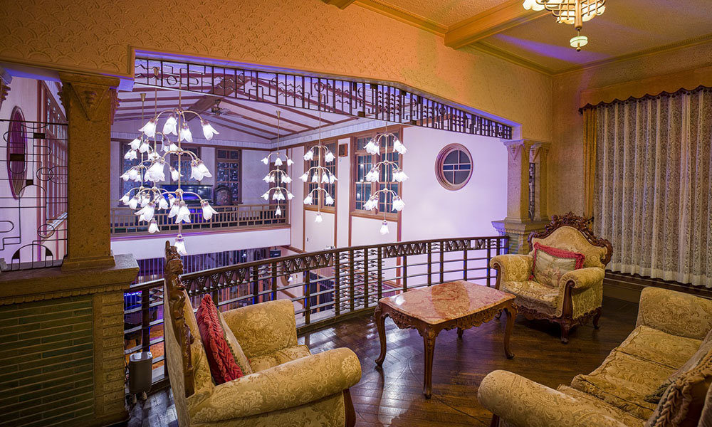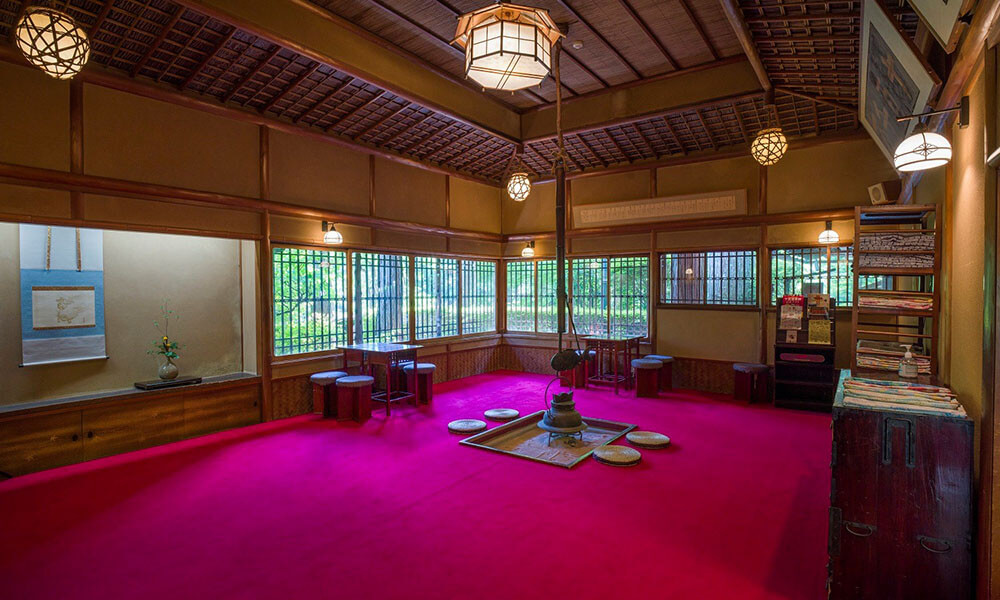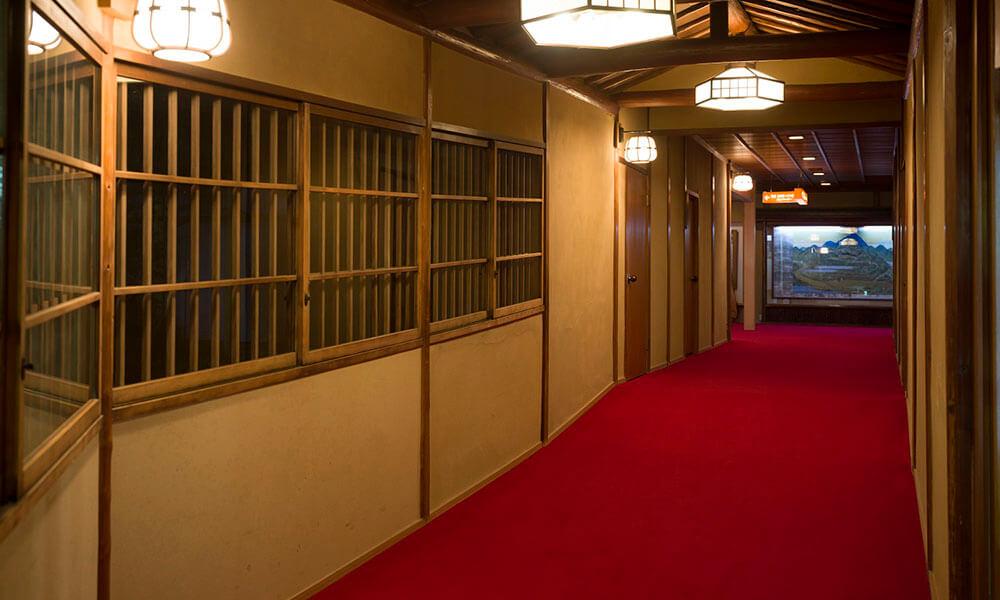 今は使われていませんが、かつてはお客様が暖を取った囲炉裏が残るロビー。天井の細工、窓の格子などなど、建築家たちも唸る手仕事が見られます。