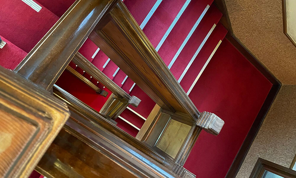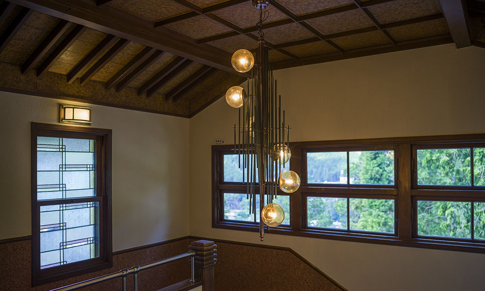 このシャンデリアは創業当初かららせん階段を照らしてきましたが、モダンで古さを感じさせないデザイン。