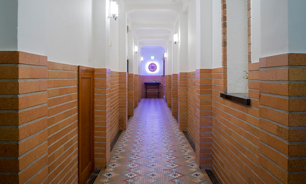 国登録有形文化財。窓にも注目を。廊下の形状に沿って斜めに枠取られ、窓ガラスも斜めにカットされた箇所も。当時の製造技術が発達していなかったためですが、ガラスの揺らめきは昭和レトロとされ、アンティーク好きはうっとり。