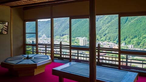 文化財に泊まることができる宿は全国でも希少です。また下呂温泉で一番の高台にあり、胸を空く美しい鳥瞰も自慢のひとつです。